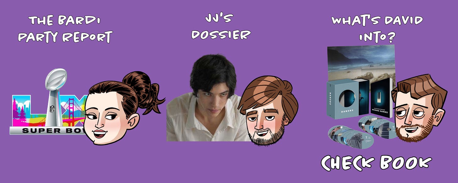 According to Eric Kohn, the halftime show was creative directed by Bad Bunny collaborator STILLZ, whose debut feature Barrio Trieste played at NYFF in October and will hit theaters sometime this year. The live broadcast was directed by veteran live event director Hamish Hamilton (who directs EVERYTHING - Super Bowls, Oscars, Grammys, Emmys, etc), and the production was overseen by Bruce and Shelley Rodgers of TRIBE, who have produced every Super Bowl Halftime since Prince. The logistics of producing the Halftime show are fascinating and honestly make me break out in stress hives - I recommend you read this deep-dive from Wired that breaks down all of the restrictions and creative solutions implemented in this year’s show.