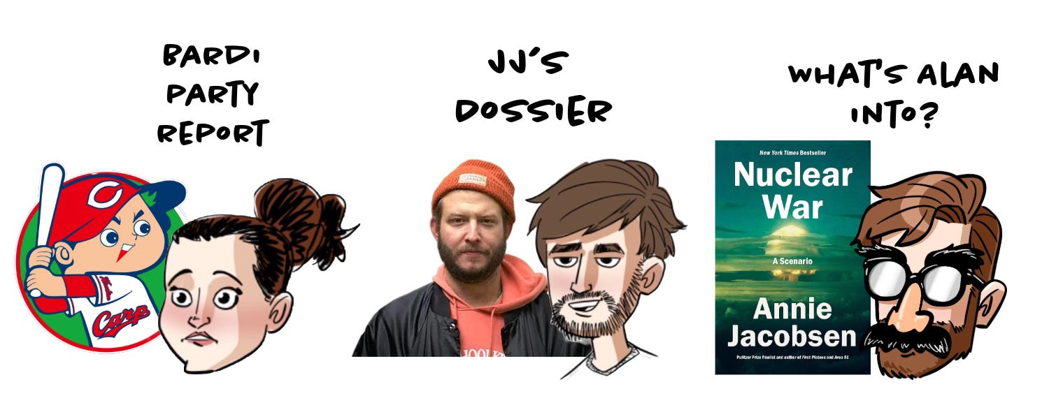 Not technically movie-related but because I brought it up in our House of Dynamite episode, my visit to Hiroshima was profoundly moving. The memorial and museum is really heavy and important, but I also found the resilience of the city itself so inspiring and joyful. Unlike Tokyo and Kyoto, Hiroshima uses streetcars as part of their transit system, and did you know that they were only down for 4 days after the bombing? Some of the train cars from the 1940s are still around! And the beloved Hiroshima Carps baseball team (who have never won a World Series) was founded only like 4 years after the bombing. I bought David a bunch of Carps merch, they’re so cute. Aside from their little Carp Boy, their other mascot Slyly is a very close relative to the Phillie Phanatic (designed by the same guy, obviously).